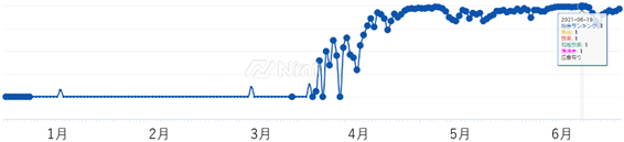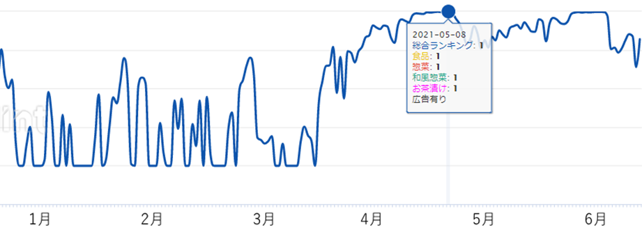 1月~3月くらいまではランキング圏外が続きますが、4月に入るとランキングに入るようになり、5月~6月はランキング上位をキープしています。6月19日には楽天市場でランキング1位になっています。広告出稿の記録もあり、RPP広告でのキーワード単価を上げるなどの施策も想定が出来そうですね。
