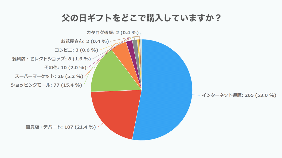 2021年は、父の日ギフトの購入手段として「インターネット通販」を利用する方が、その前の年に比べて約20%も増えました。一方で、百貨店・デパート、ショッピングモールといった実店舗に行く方が減少し、やはりコロナ禍で外出を控えていた傾向がみられました。引用:「父の日.jp」https://chichinohi.jp/survey019/