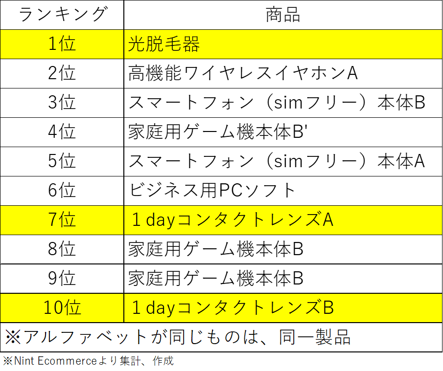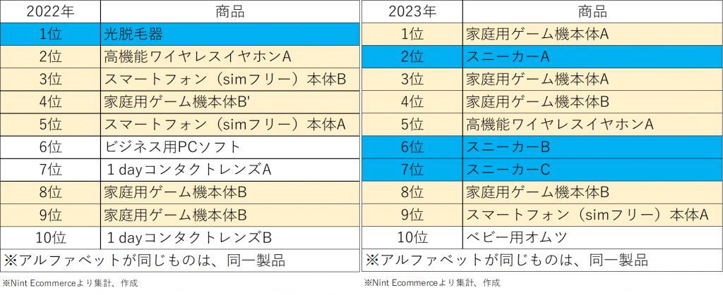 2023年の傾向は見えましたが、3大ECモールにおけるこの商品売上ランキングは2022年でも同様の傾向だったのでしょうか。おそらく異なるのではないでしょうか。