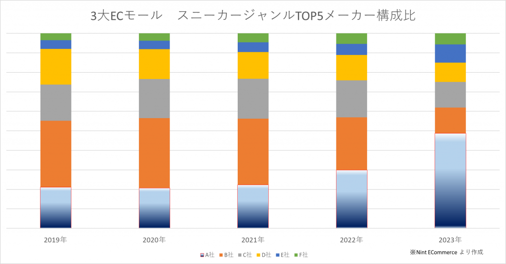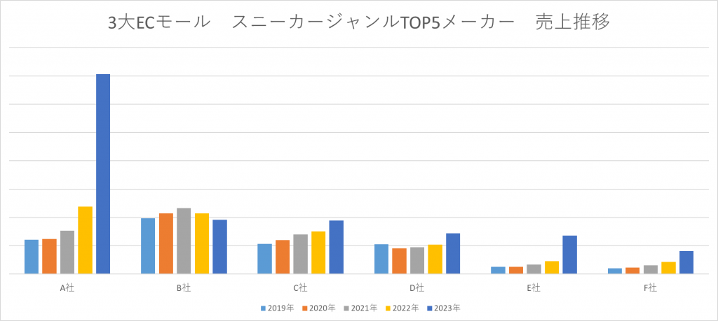 裏付けするように、3大ECモールにおけるスニーカージャンルは2023年に急上昇しており、更にA社の売上構成比は上昇、3大ECモール市場において、その存在感を現わにしています。下記の図をご覧ください。3大ECモールのスニーカージャンル市場規模は、2022年まで毎年微増傾向で伸長しておりましたが、2023年になり、急上昇をしております。(※2023年は12月売上分を含まない)このことからも、2023年にEC市場で「スニーカーブーム」が起きたことは間違いなさそうです。また、今回A社ブランドの商品が3品ランクインしておりますが、メーカー売上構成比、メーカー売上推移を確認しても、「スニーカーブーム」の中でも特に「A社」のブランドが好まれて購入されたことが分かります。