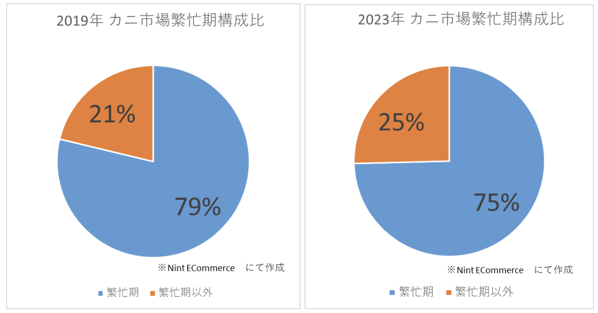 繁忙期のみで、売上構成比が7割を越える市場は多くないため、カニ市場がいかに特徴的であるかが分かります。