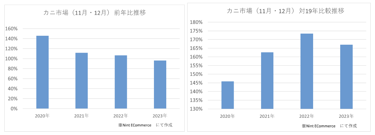 ECモールのカニ市場は、コロナ禍である2020年に前年比140%以上で成長、その後、2021年、2022年と成長を続け、2023年では前年比96%で推移しました。2022年からの前年割れ要因としては、「オフライン市場」での購入と「需要の分散」による影響が考えられます。前年割れとなったカニ市場ですが、その市場規模は、2019年と比較すると165%以上と、コロナ禍前と比べて成長していることが分かります。ECのカニ市場は、24時間いつでも手軽に注文でき、自宅まで配送してくれる利便性が消費者にも浸透した結果、コロナ禍前よりも成長している市場と言えます。