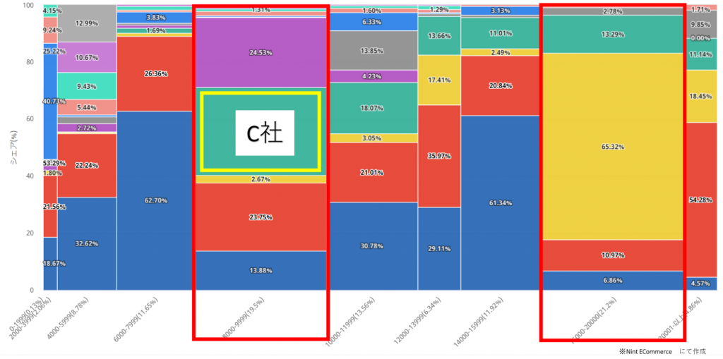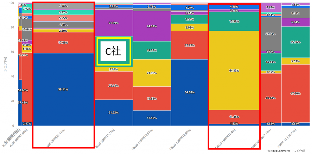 2つ目は、2023年に中心価格となった価格帯で好調企業C社がシェア率を上昇させた点です。C社好調要因は、高単価化によりC社のシェア率が上昇したのか、C社のシェア率が上昇したことで、価格帯が押し上げられたのか、判断していく必要がありそうです。