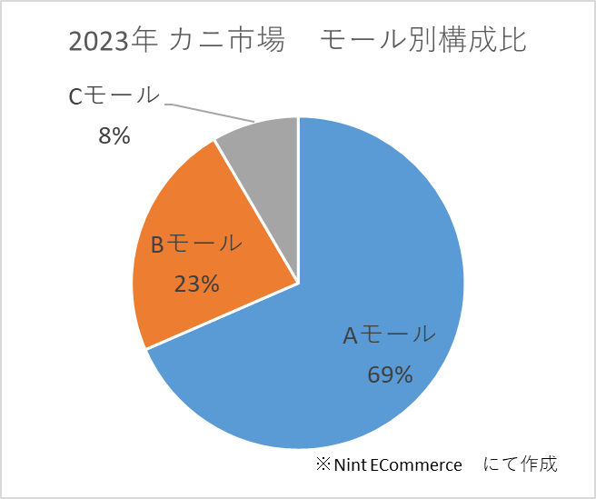注目は2022年から2023年にかけて市場シェアを3%上昇させたC社です。C社の動向と市場の変化を、2023年度のカニ市場で69%の構成比を占める(図7)Aモールにて詳細を確認します。