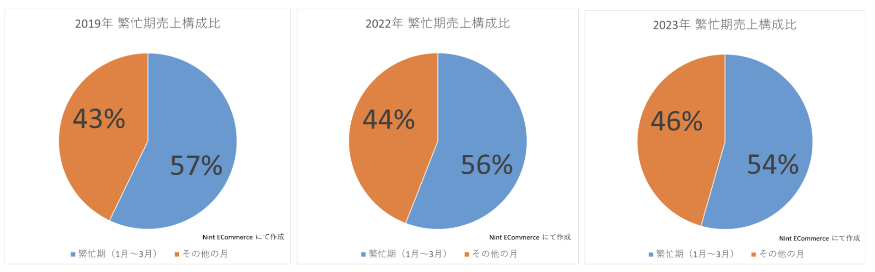 図11:2019年(左)、2022年(中央)、2023年(右)における、チョコレート市場年間売上にける、繁忙期の売上構成比