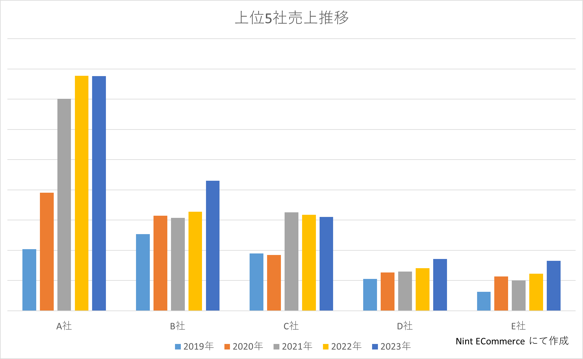 チョコレート市場は上位5社で37%のシェアを占めています。現在は、A社がシェア率16%と他の4社に比べ一歩抜きん出ています。上位5社が占める市場シェアに関しては、2022年と変化はありません。一方で、2019年からの5社の売上推移を確認すると、売上を急激に伸ばした「A社」「C社」において2023年横ばい~売上の減少が、「B社」に関しては、売上の増加が起きています。A社・C社は先ほど述べた需要の分散により、主力商品での苦戦が見られました。