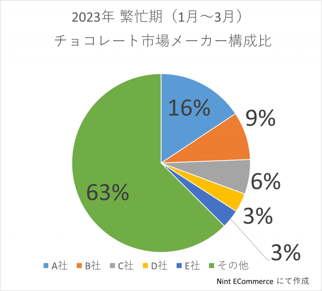 繁忙期におけるチョコレート市場のメーカー構成比を確認します。