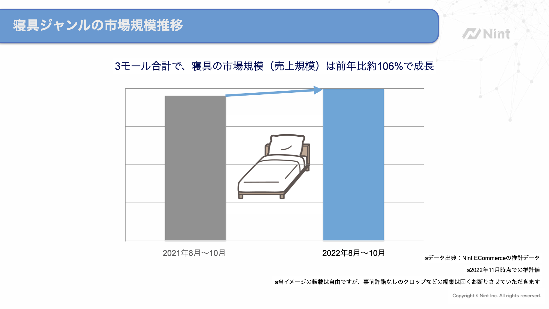 Amazon、楽天市場、Yahoo!ショッピングの3モールにおいて、Nint推計データ(2022年11月時点)より、2022年8月~10月の寝具ジャンルは快眠需要の追い風を受けて拡大トレンドが継続しています。