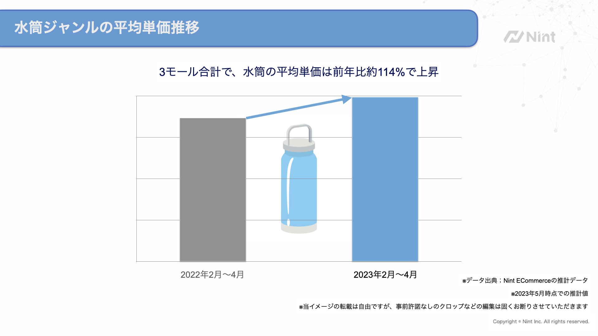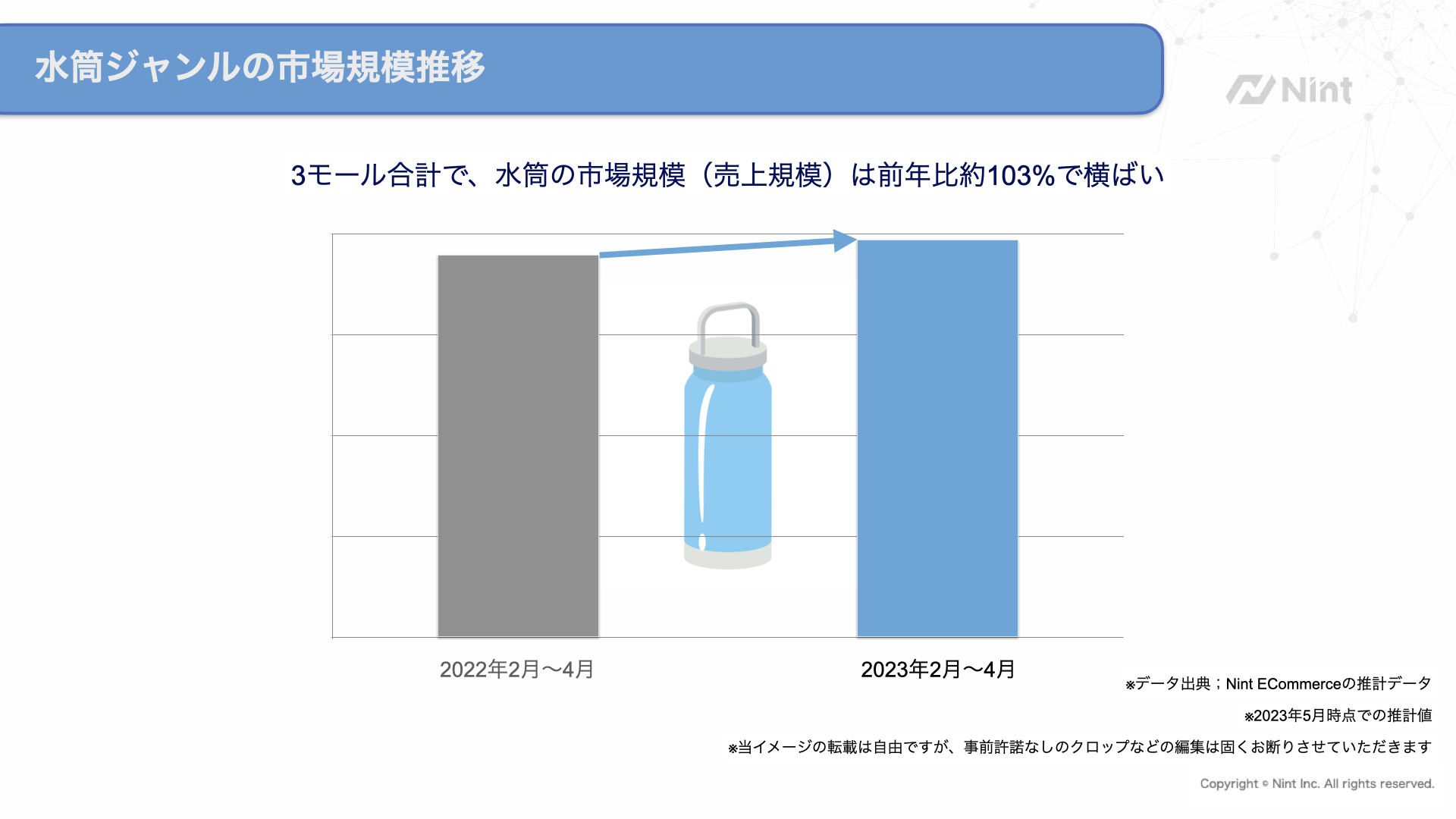 Amazon、楽天市場、Yahoo!ショッピングの3モールにおいて、2023年5月時点のNint推計データより、2023年2〜4月の水筒ジャンルは当該時期の市場規模は2022年2月〜2022年4月と比較して103%となりました。今後の売上規模は推計値を元にした当社のAI分析を踏まえると、3モールにおいて当該ジャンルは横ばいという結果となりました。