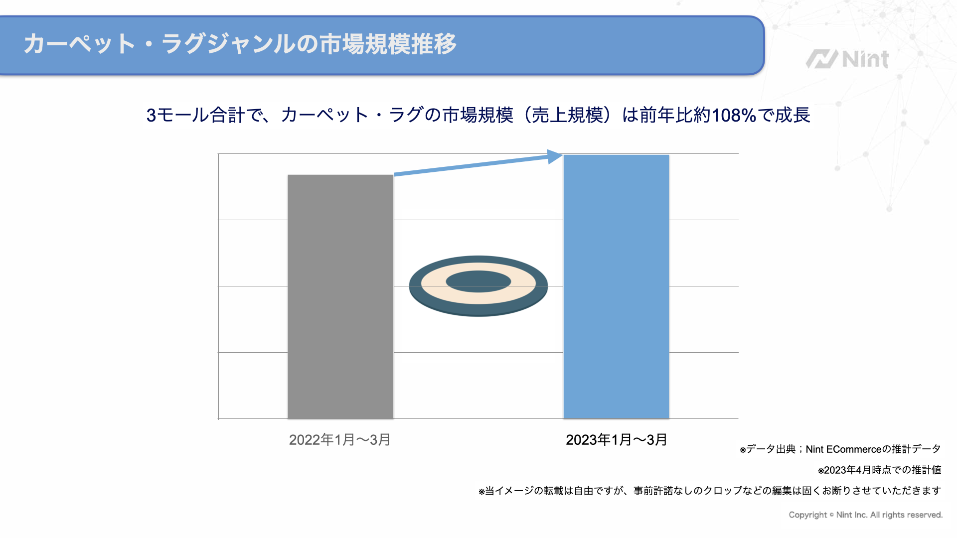 Amazon、楽天市場、Yahoo!ショッピングの3モールにおいて、2023年4月時点のNint推計データより、2023年1〜3月のカーペット・ラグジャンルは新生活の需要の追い風を受けてトレンドの拡大が見られました。当該時期の市場規模は2022年1〜3月と比較して108%となり、市場が堅調に拡大しています。推計値を元にした当社のAI分析を踏まえると、3モールにおける当該ジャンルの今後の売上規模は、横ばいとの結果となりました
