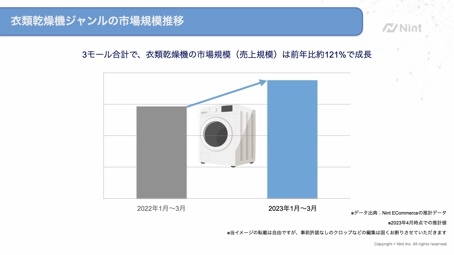 Amazon、楽天市場、Yahoo!ショッピングの3モールにおいて、2023年4月時点のNint推計データより、2023年1〜3月の衣類乾燥機ジャンルは買い替えニーズの追い風を受けて拡大しております。当該時期の市場規模は2022年1〜3月と比較して121%となり、市場が急速に拡大しています。今後の売上規模は、推計値を元にした当社のAI分析を踏まえると、3モールにおいて当該ジャンルは、横ばいの結果となりました。