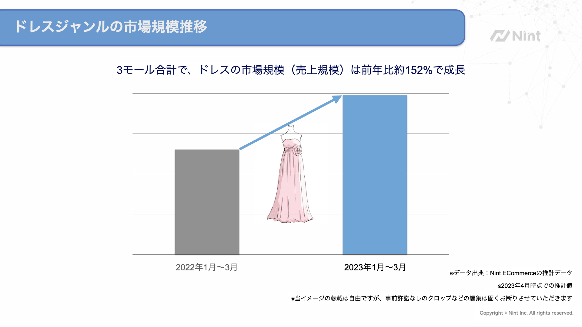 Amazon、楽天市場、Yahoo!ショッピングの3モールにおいて、2023年4月時点のNint推計データより、2023年1〜3月のドレスジャンルはコロナ禍終息に向かい結婚式などのパーティ需要の追い風を受けて拡大トレンドとなっております。