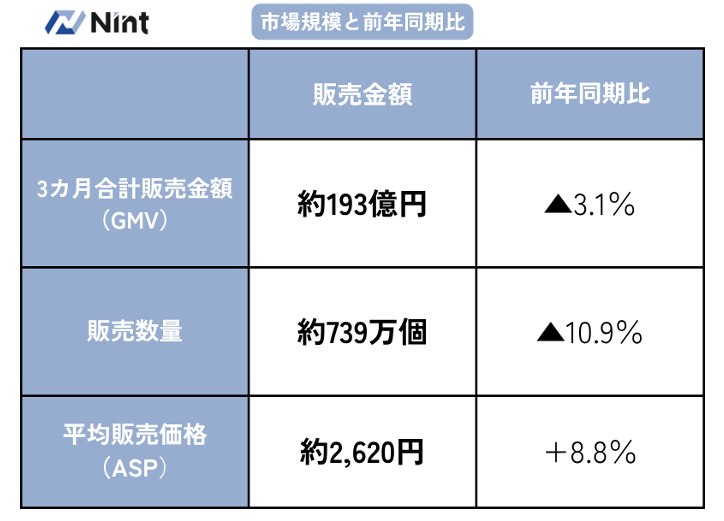 キッチン用品市場は大手ECサイトでの販売金額(GMV)が約193億円(前年同期比▲3.1%)、販売数量は約739万個 (前年同期比▲10.9%)、平均販売価格(ASP)は2,620円(前年同期比 +8.8%)で着地しました。販売数量は減少している一方で、ASPは緩やかに上昇しており、「点数は抑えながら、やや単価の高い商品を選ぶ」買い方が強まっていると考えられます。
