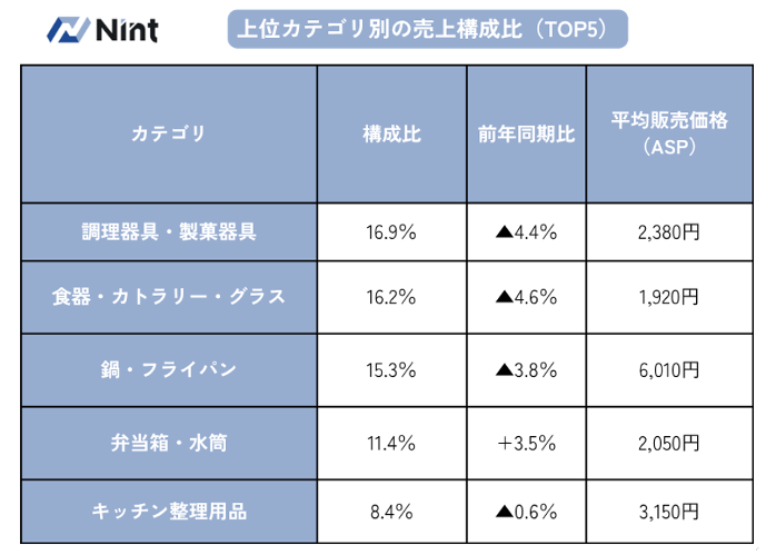 売上の中心は「調理器具・製菓器具」「食器・カトラリー・グラス」「鍋・フライパン」の3カテゴリでキッチン用品市場のベースゾーンになりました。