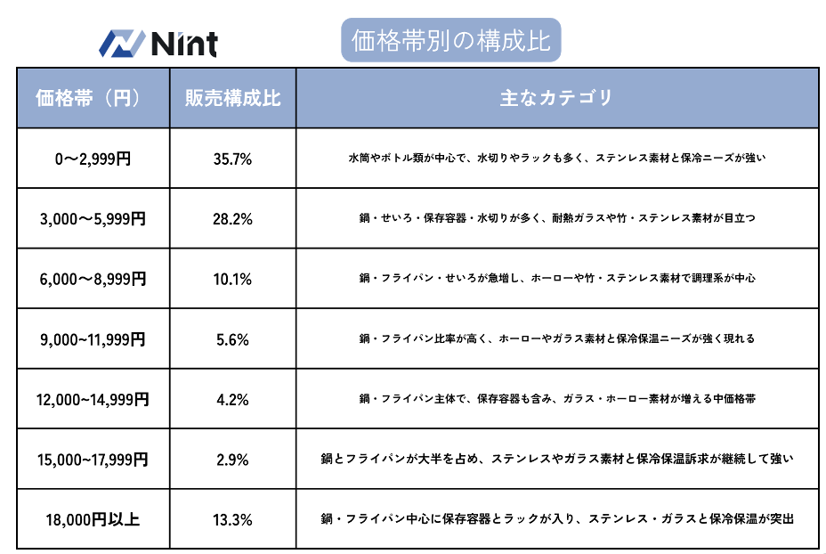キッチン用品の価格帯をならして見ると、低価格帯の小物・消耗品から、日常使いのボリューム帯、そして中〜プレミアム帯のこだわり商品までが層を成している様子が分かります。安価なツールや弁当箱・保存容器などは数量を稼ぎやすい一方で、1点あたりの利益は薄くなりやすく、価格比較も起こりやすいゾーンです。