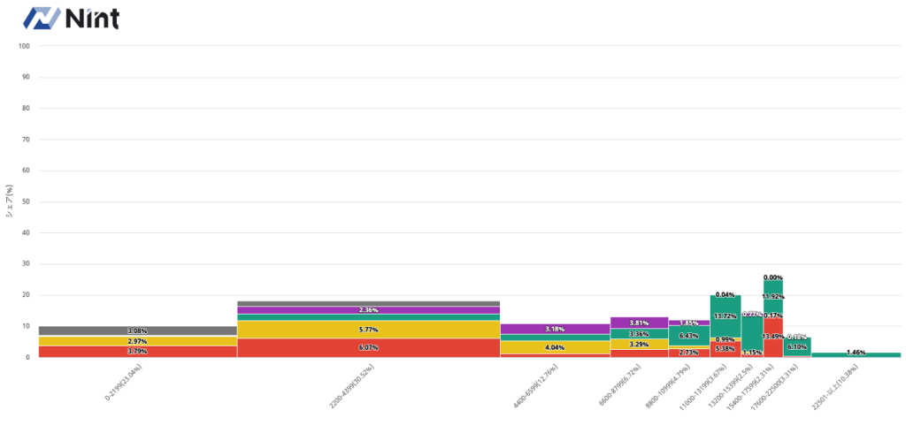 市場の見える化を実現するツール「Nint ECommerce」でTOP5メーカーの価格別売上構成比を見ると以下のように確認できます。