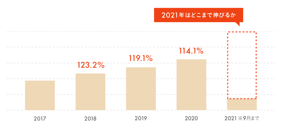 このグラフを見ると毎年、7月〜8月程度から売上が伸びはじめ、11月と12月に大きなヤマを迎えていることがわかります。