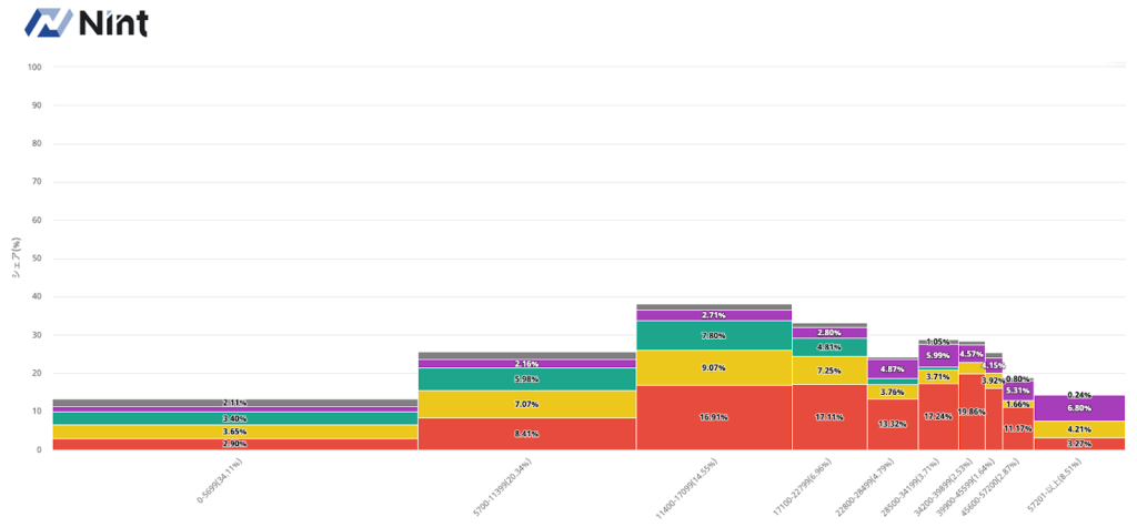 市場の見える化を実現するツール「Nint ECommerce」でTOP5メーカーの価格別売上構成比を見ると以下のように確認できます。