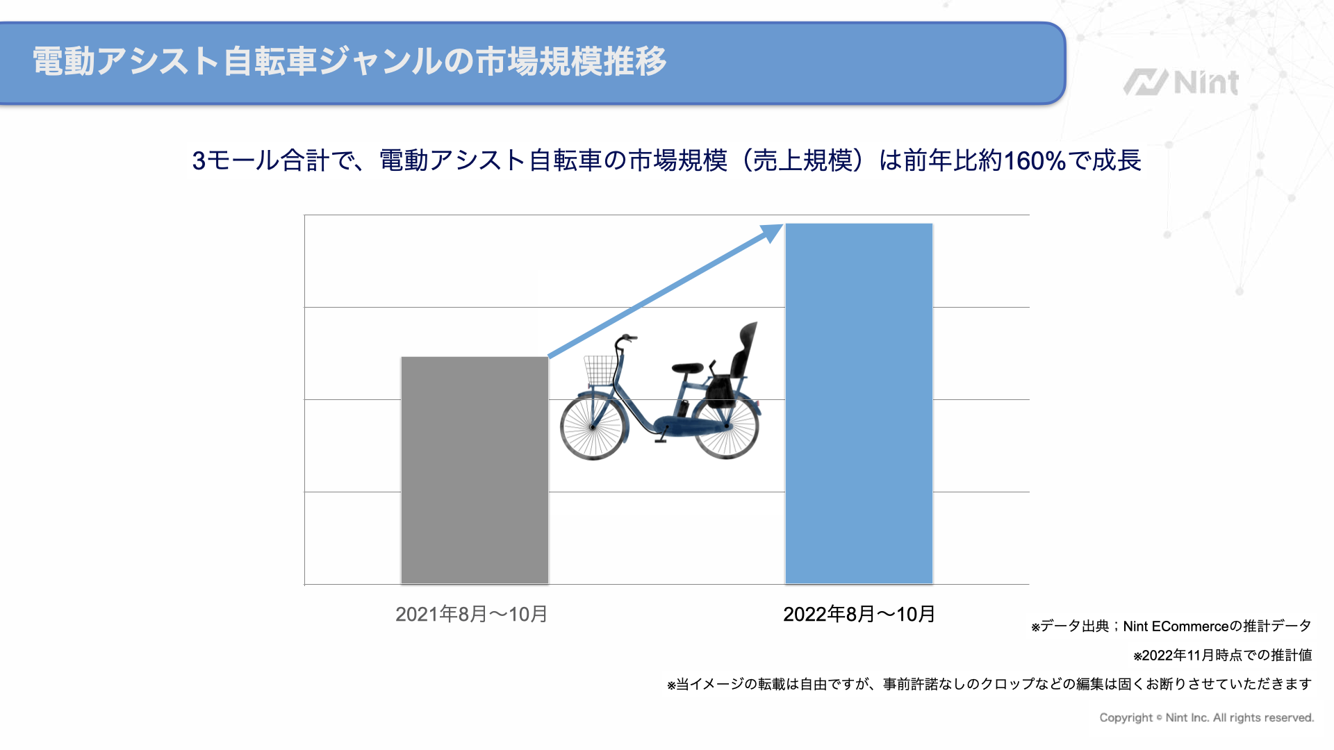 Amazon、楽天市場、Yahoo!ショッピングの3モールにおいて、Nint推計データ(2022年11月時点)より、2022年8~10月の電動アシスト自転車ジャンルは通勤・通学などの外出需要が回復してきた追い風を受けて拡大トレンドが継続しています。