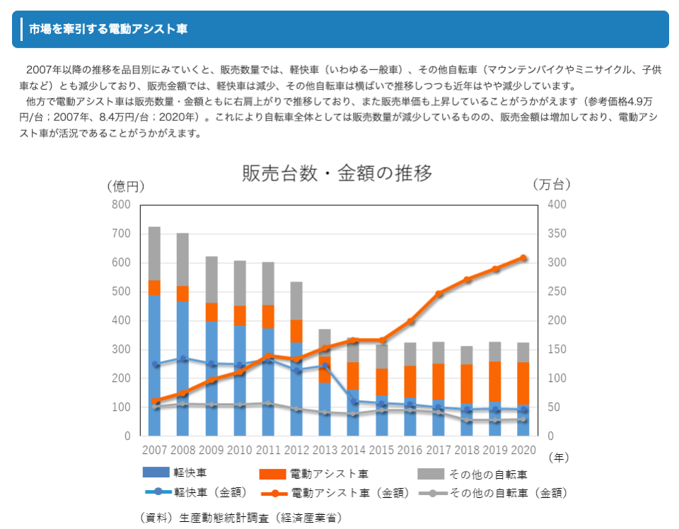 2021年の経済産業省の調査によると近年電動アシスト車が自転車市場を牽引しているとの内容でしたが、その状況が継続しております。