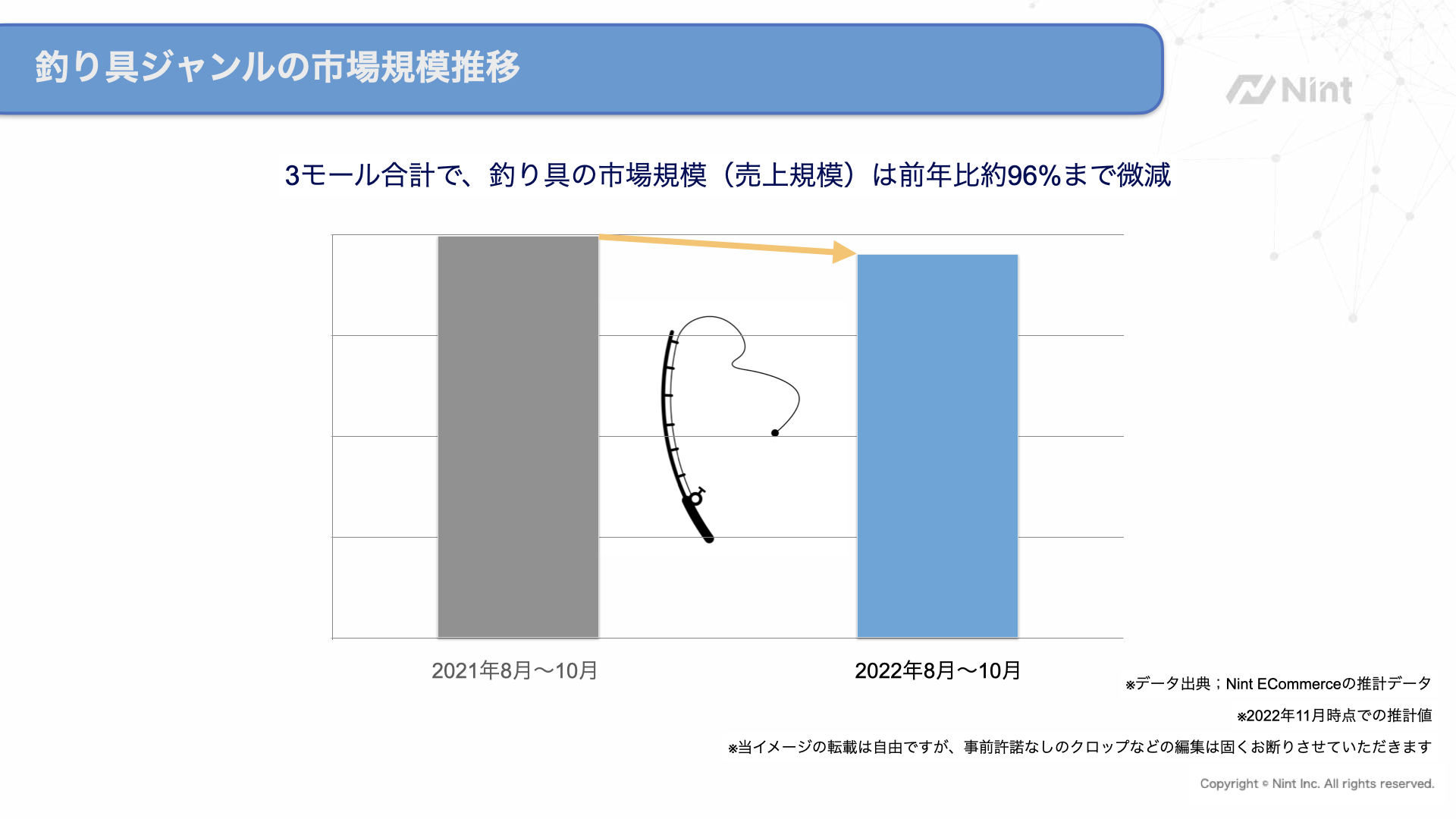 Amazon、楽天市場、Yahoo!ショッピングの3モールにおいて、Nint推計データ(2022年11月時点)より、2022年8~10月の釣り具ジャンルは昨年のアウトドア需要急増の反動を受けて減少となりました。当該時期の市場規模は2021年8〜10月と比較して96%となり、市場が若干縮小しました。