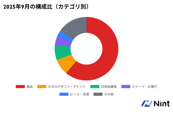 食品カテゴリが構成比61.0%を占め、前年同期比99.1%の前年並みの水準成長を記録しました。カタログギフト・チケットは前年同期比252.4%という驚異的な成長を見せており、受取人が自由に選べる利便性が評価されています。
