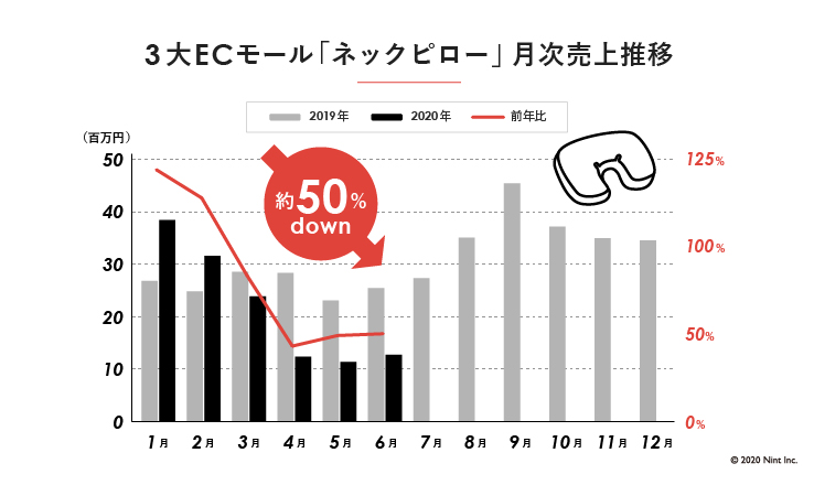 ネックピローの売上はスーツケース・キャリーバッグの売上ほどではないものの、4月は昨年対比で43%の1,200万円となっており、その後も昨年比で5月は49%、6月は50%の売上となっています。