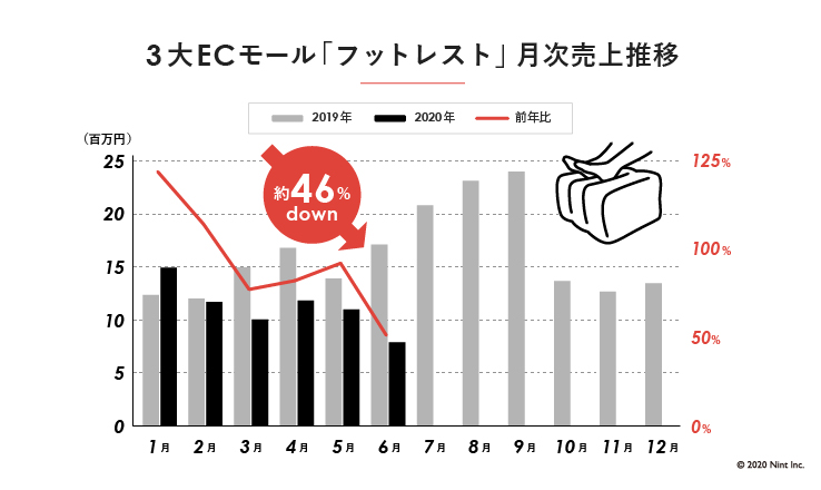 フットレストは着座時に足を置いて休める商品のため、旅行での移動時はもちろん、デスクワークのアイテムとしても利用可能です。フットレストの売上は3月、4月、5月の昨年比で67%、71%、79%と一定の回復を見せていましたが、6月は46%と大きく落ち込んでしまいました。