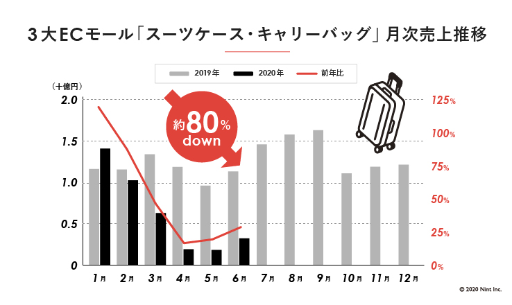 楽天市場、Yahoo!ショッピング、Amazonのスーツケース・キャリーバッグの売上は、今年1月は昨年比120%の約14億円と好調な伸びを示していました。しかし、コロナ禍による外出自粛の影響で月を追うごとに売上が大きく落ち込み、4月には昨年対比でわずか16%(2億円弱)まで売上が落ち込んでいます。