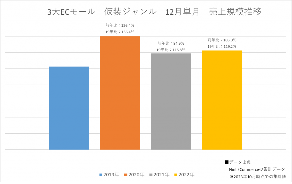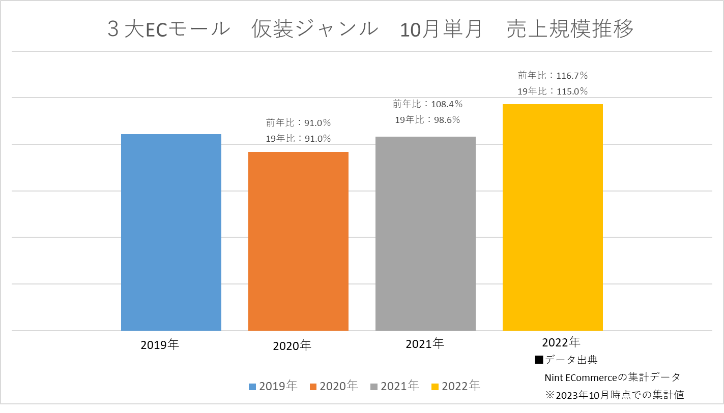 市場全体と2つの需要月(10月・12月)で市場規模推移が異なるのは大変興味深く、2019年時の仮装・コスプレ需要と、コロナ禍を経た今の需要では、変化が起きているのではないかと思われます。