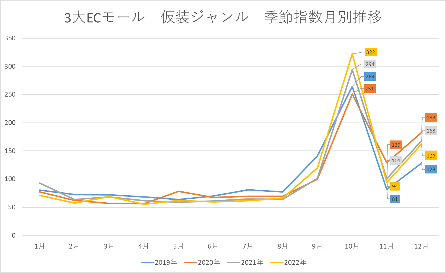 図3の結果から、3大ECモールの仮装ジャンル市場は、10月にピークを迎え、12月にも10月に次いだ「ヤマ」があることがわかります。