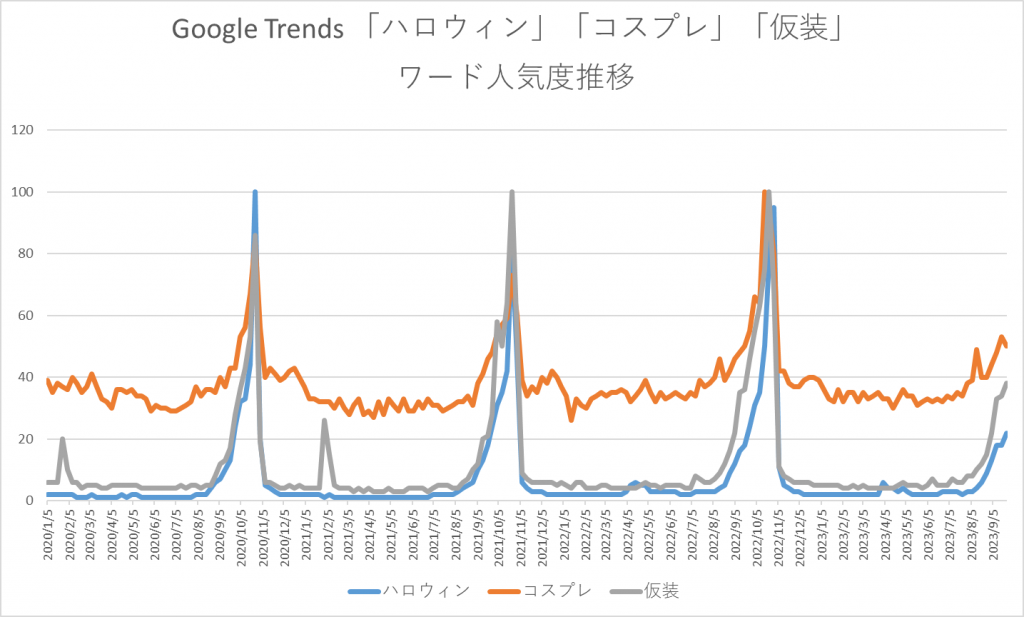 この結果を見ると、「ハロウィン」と「仮装」に関しては非常に類似した動きが見られます。「コスプレ」も同様にハロウィン時期に「仮装」と同様に検索される傾向が見られました。