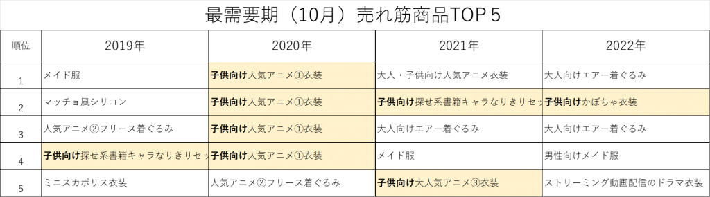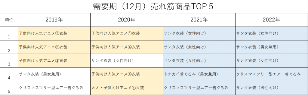 仮装・コスプレ市場は「コロナ禍」の影響を大きく受け、コロナ禍前とコロナ禍中~アフターコロナに関して、消費者の需要の変遷が見られます。その特徴が10月・12月の動きにと、2019年~2022年の売れ筋TOP5商品にも現れております。