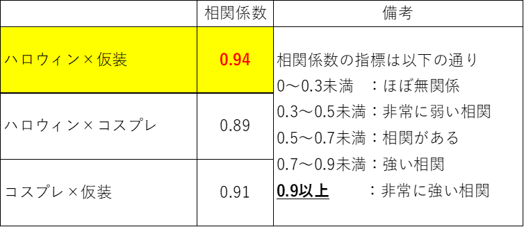 「ハロウィン」と「仮装」の相関係数は、0.94となり、これは非常に強い相関関係であると言えます。
