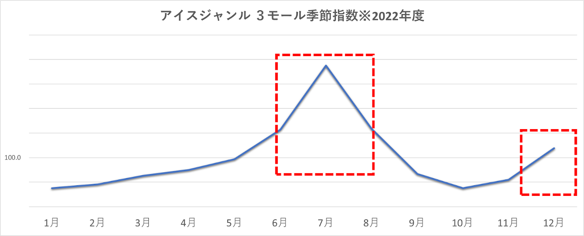 <NintECommerceを使った季節トレンドの確認>EC3大モールにおける、アイスの市場はいつ高まるのでしょうか?3モールの平均売上を100とした季節指数の推移表を作成いたしました。(図1)