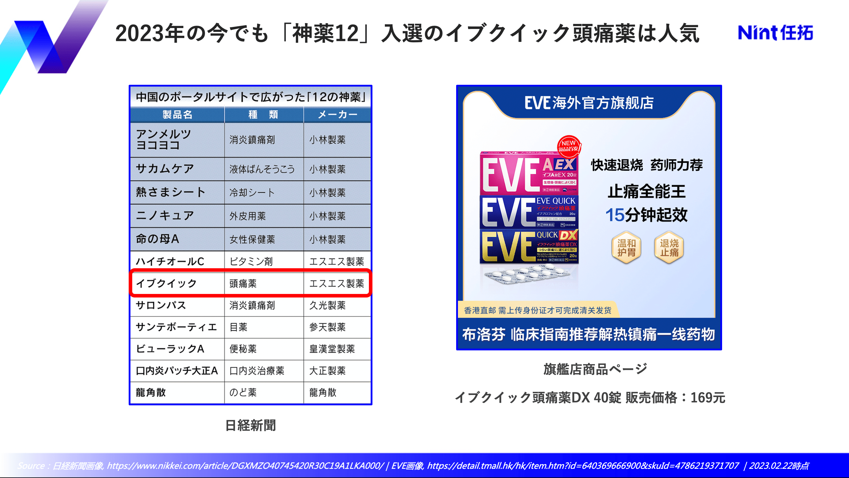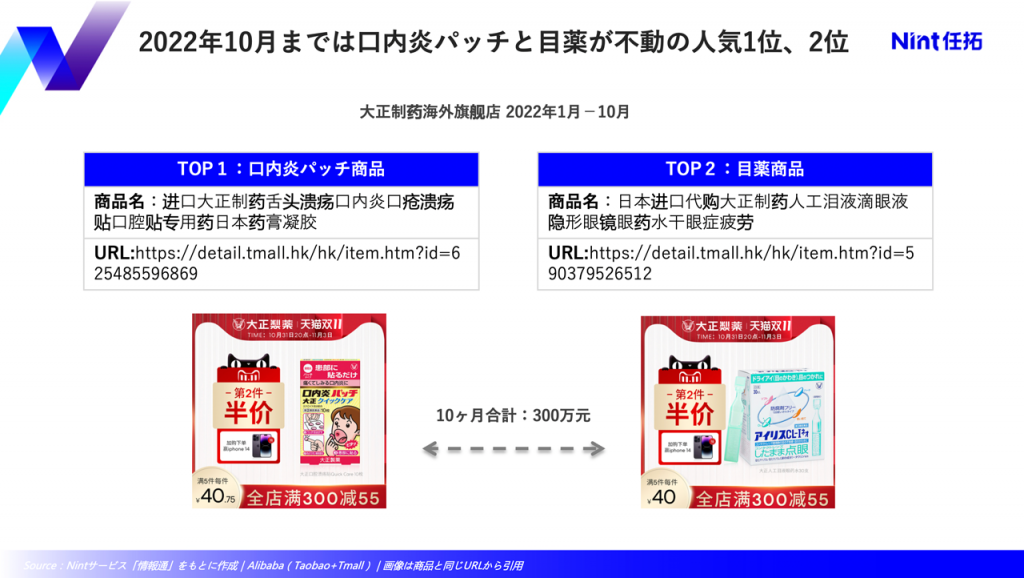 大正製薬は、天猫国際にて2019年5月に「大正制药海外旗舰店」を開店した。当年は目薬商品と「神薬12」入りしている口内炎パッチ商品が売上における大きなシェアを占めた。その後も、2022年10月までは依然としてニ商品が店舗売上TOP1、2に位置つけていた。