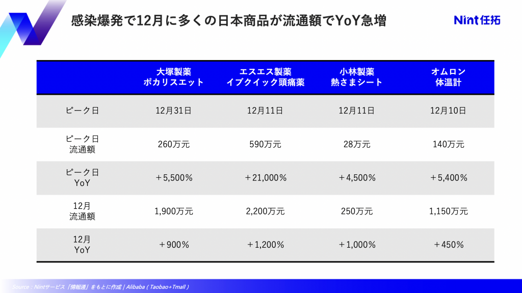 感染ピークの12月には食品飲料や医薬品など、栄養補給や症状緩和の目的で、多くのカテゴリで関連商品の売上が急激に増加した。例えば、以下日本商品が挙げられる。