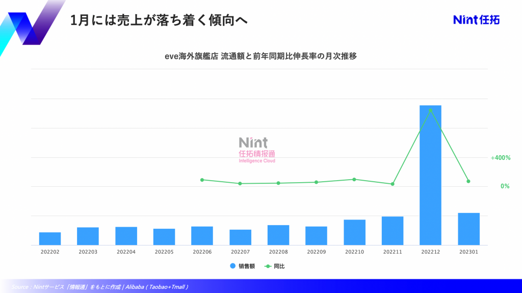 新型コロナウイルスによりインバウンドが途絶えた2020年からは、アリババ集団の越境ECサイト天猫国際で流通が始まり、2021年6月には「eve海外旗艦店」が開店した。継続的に売上が成長してきた中、この度の感染爆発により商品需要が再熱した。しかし、1月には需要が落ちつく傾向となり、MoMは-77%と12月から急下した。