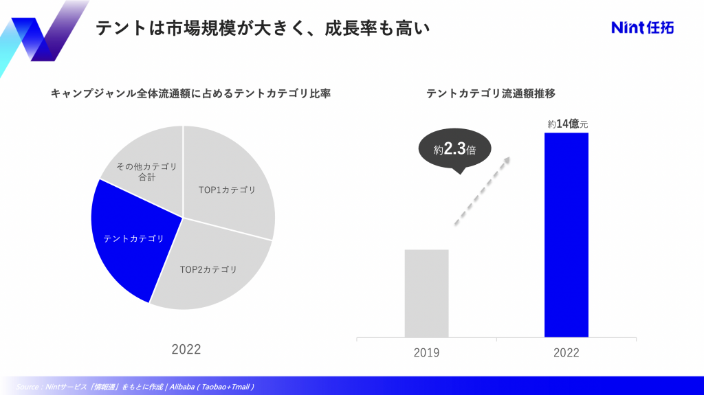 アウトドア商品ジャンルの中でもテントカテゴリは規模が大きく、成長率も高い。