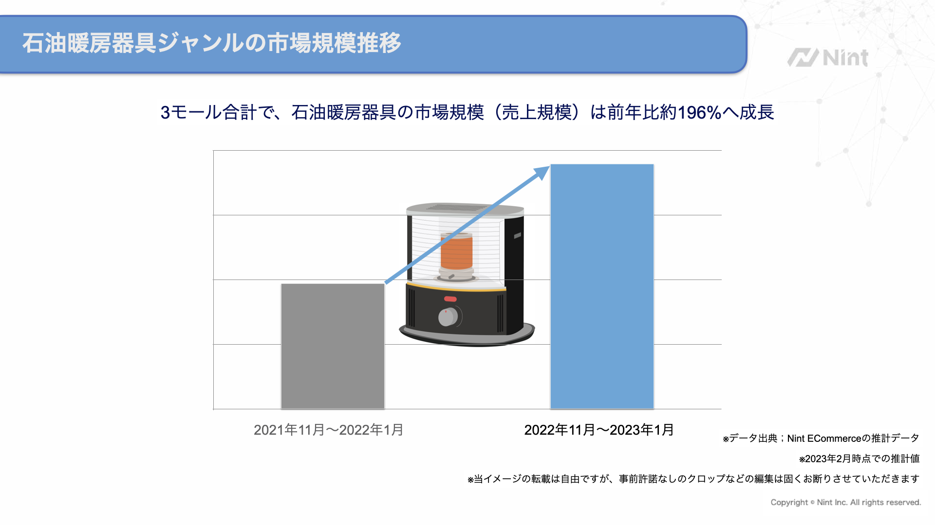 Amazon、楽天市場、Yahoo!ショッピングの3モールにおいて、Nint推計データ(2023年2月時点)より、2022年11月~2023年1月の石油暖房器具ジャンルは電気料金値上げによる節電意識の高まり、外出自粛緩和の追い風を受けて拡大トレンドしております。