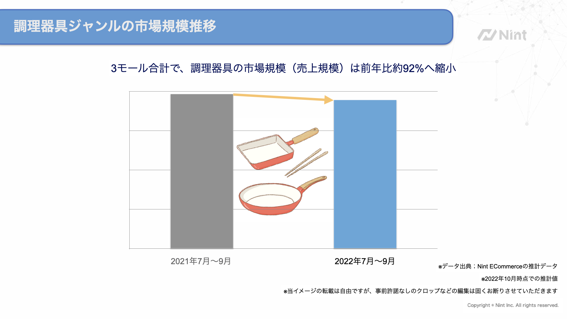 Amazon、楽天市場、Yahoo!ショッピングの3モールにおいて、Nint推計データ(2022年10月時点)より、2022年7月~9月の調理器具ジャンルは昨年の巣ごもり需要による増加の反動を受けて減少となりました。