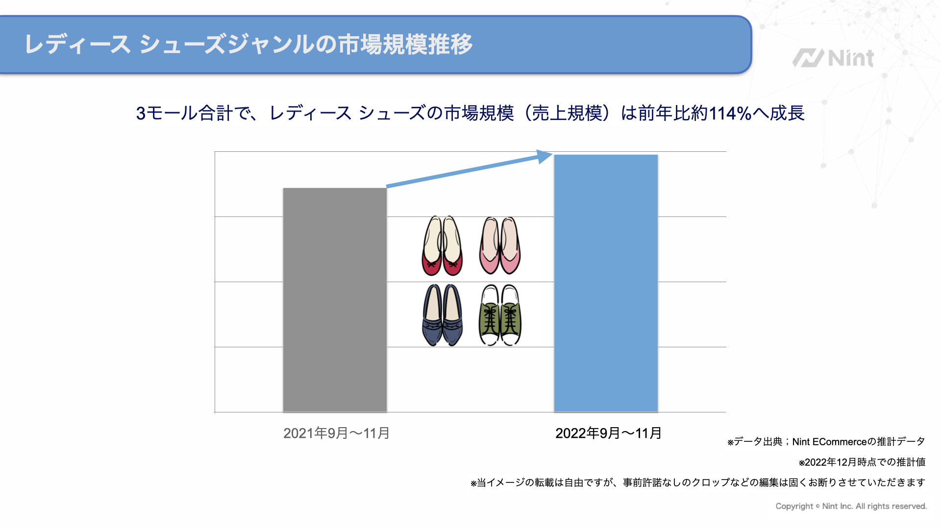 Amazon、楽天市場、Yahoo!ショッピングの3モールにおいて、Nint推計データ(2022年12月時点)より、2022年9月~11月のレディース シューズジャンルは行動制限の緩和による外出需要の追い風を受けて拡大トレンドとなっております。