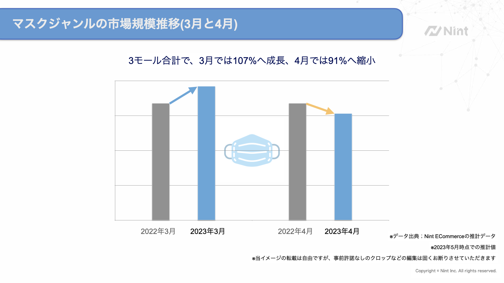 Amazon、楽天市場、Yahoo!ショッピングの3モールにおいて、2023年5月時点のNint推計データより、2023年3〜4月の「マスク」ジャンルは前年同時期比で99%へと横ばいでの推移となりました。