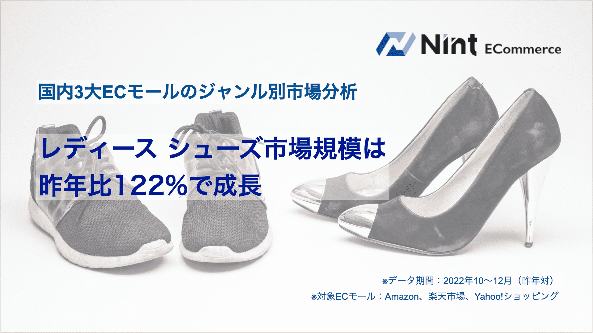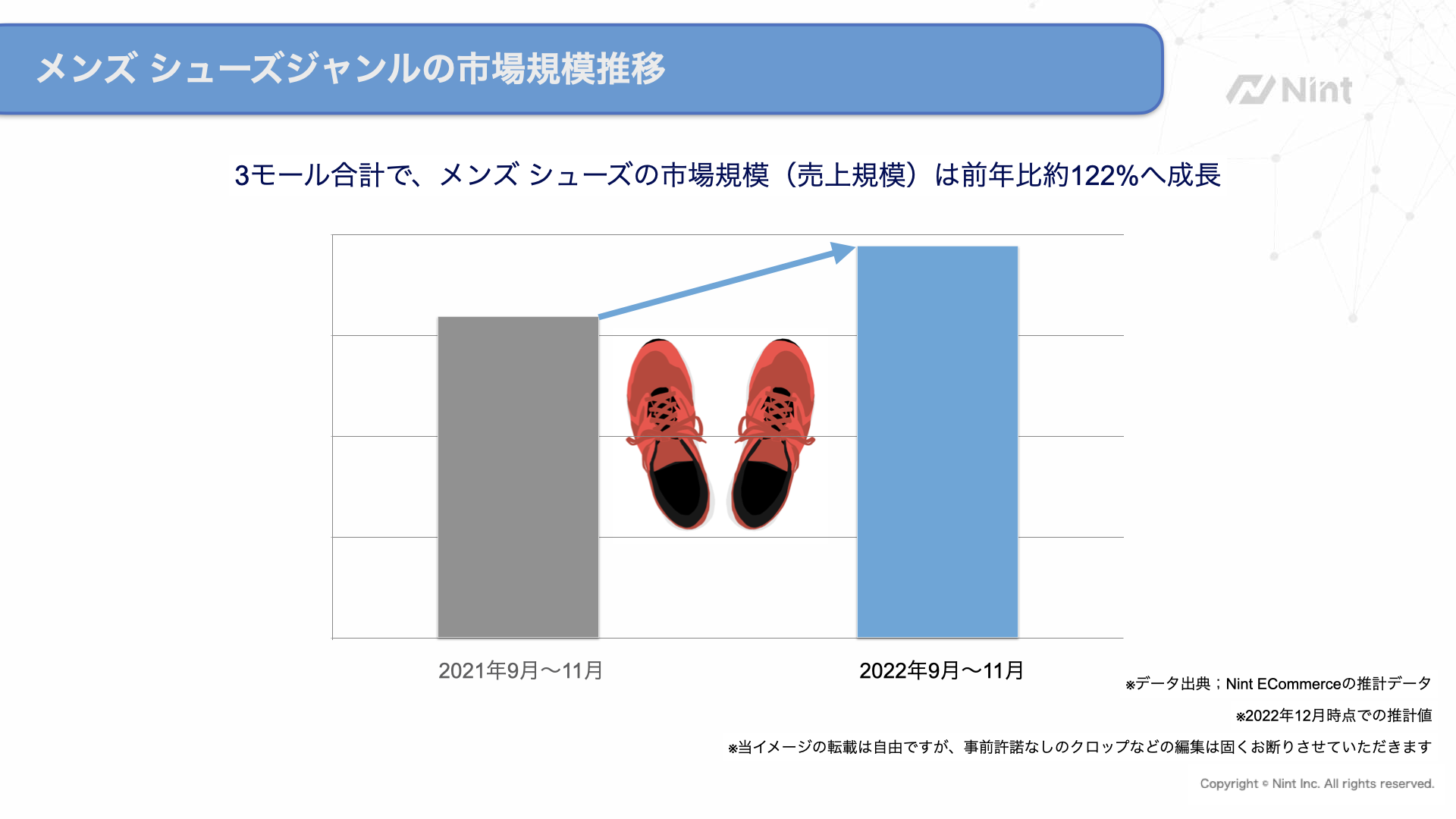 Amazon、楽天市場、Yahoo!ショッピングの3モールにおいて、Nint推計データ(2022年12月時点)より、2022年9月~11月のメンズ 外出需要の追い風を受け、特にスニーカーが好調で拡大トレンドとなっております。