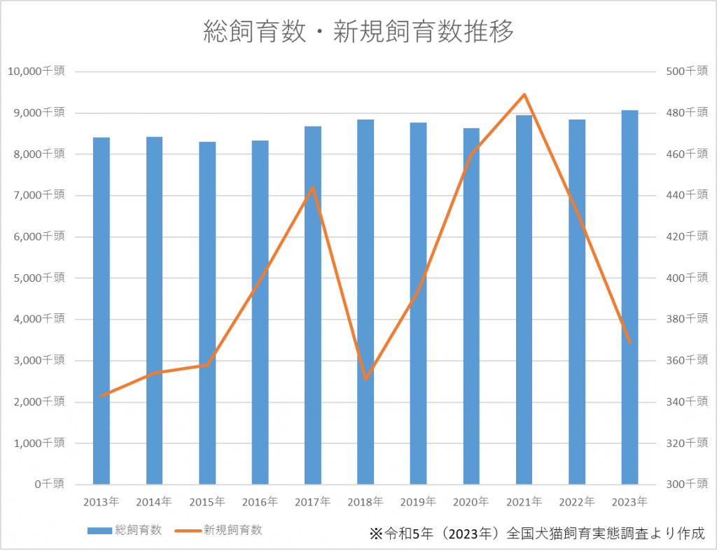 2013年からの調査期間で、1年間の新規飼育数の増加が最も高いのが、この2019年から2020年にかけてです。新規飼育頭数は2021年の48.9万をピークに減少傾向が続いております。