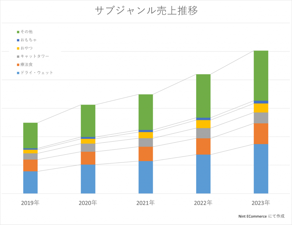各年の前年比を見るとコロナ禍・非コロナ禍の比較となる2020年に「キャットタワー」や「おやつ」、「おもちゃ」などの高い伸長がみられます。これは、既存飼育者が購入場所をオフラインからECへ変更したことと新規飼育者が増加し、新規飼育者の多くがECでの購入をしたという2つの要因が考えられます。また、2023年の各サブジャンルの推移にも注目です。好調に推移していた「おやつ」の成長率が低下し、療法食が伸長している点は、甘やかし過ぎた結果、肥満体系や病気を発症してしまった、もしくは発症予備軍となってしまった結果、「健康管理」の意識が上昇した結果ではないかとも推察できます。