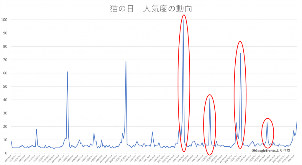 一方、小さい「ヤマ」として、近年は「8月」も上昇傾向が見られます。これは、先ほどの「世界猫の日」が8月8日に制定されていることが影響していると想像できます。