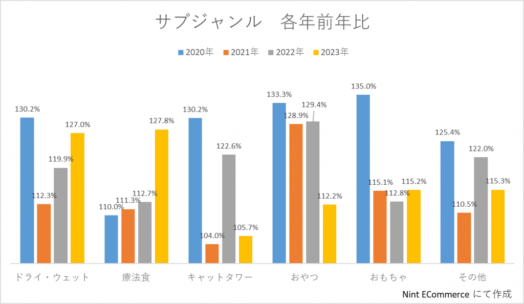 分類したジャンルは「おもちゃ」「おやつ」「キャットタワー」「療法食」「ドライ・ウェット(キャットフード)」に加え、それ以外の総称として「その他」の6ジャンルです。6ジャンルの前年比に関しても併せて確認しました。