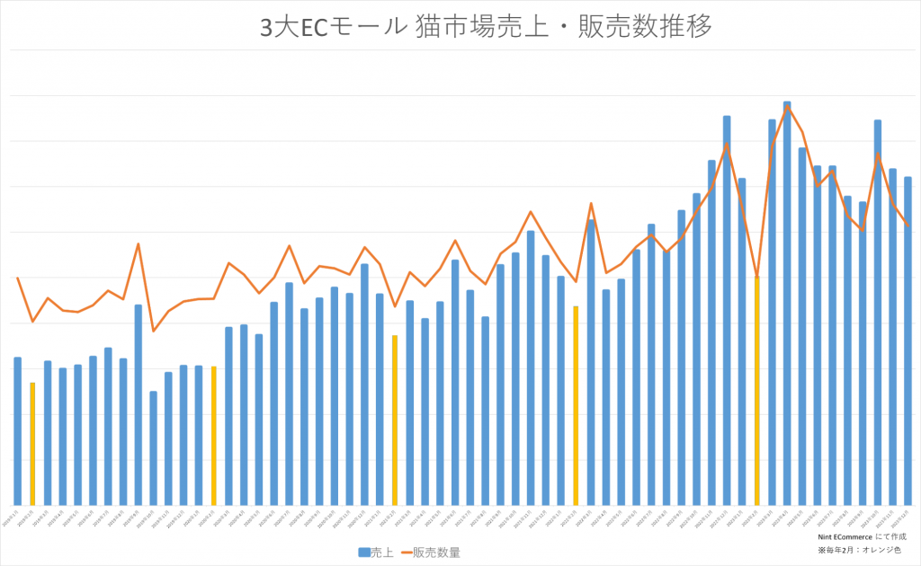 3大ECモールでの猫市場は年々上昇傾向であり、販売数量も増加傾向であることが、図3より確認できます。また、「2月」の売上は各年とも低く、少なくとも現段階では、「猫の日」が売上とは連動せず、「話題性」のみで完結していることも伺えます。