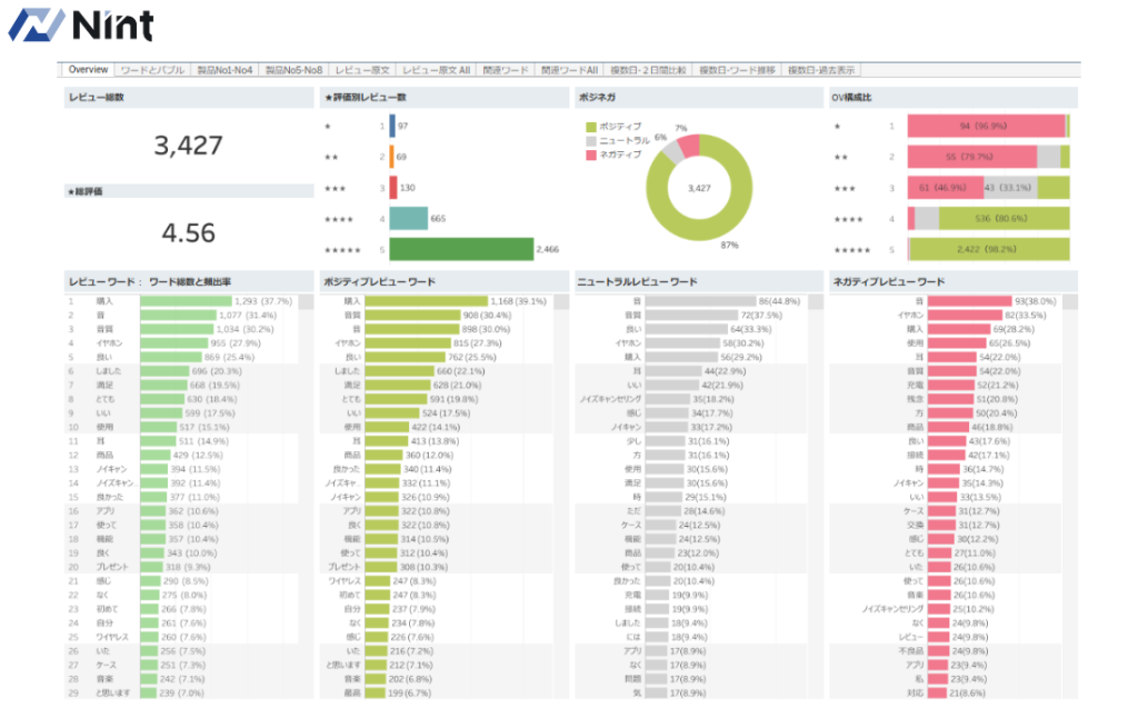 なおNintでは、高評価点と要改善点の重要度を図る指標として、レビューを単語レベルに区切って単語の出現率の集計をした「レビュー分析レポート」の作成も承っております。お気軽にお問い合わせいただければと存じます。
